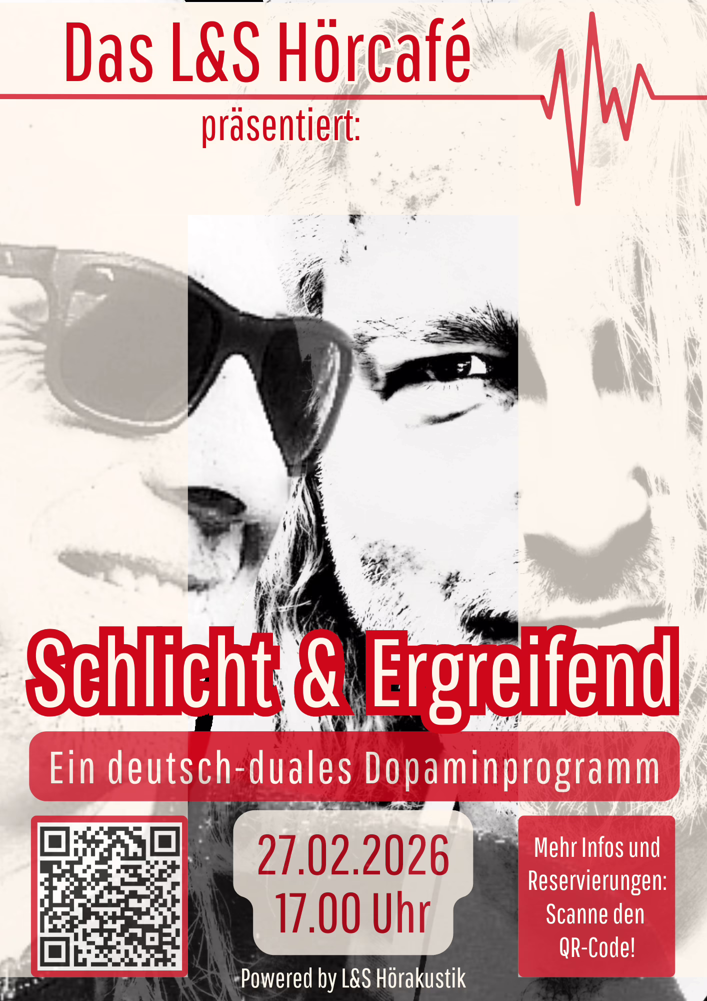 Am Freitag, den 27. Februar 2026 um 17:00 Uhr öffnen wir wieder die Türen zum 6. KulturCafé bei L&S Hörakustik – und diesmal steht das Duo Schlicht & Ergreifend auf unserem berühmten Ein-Quadratmeter-Podest, mit dem Ziel eure Lachmuskeln zu massieren und die Ohren zu verwöhnen.